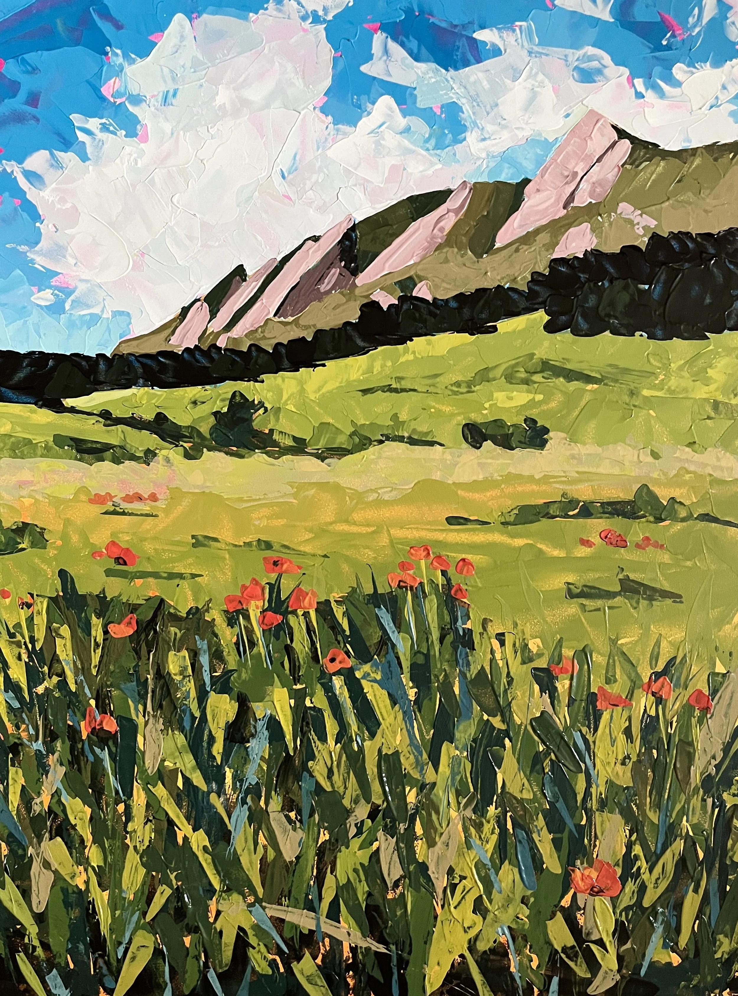 This is my newest painting of the spring poppies and Flatirons as seen from Chautauqua. I painted this from a photo I took in June of 2025, and I can’t wait to paint another poppies with Flatirons painting again soon!