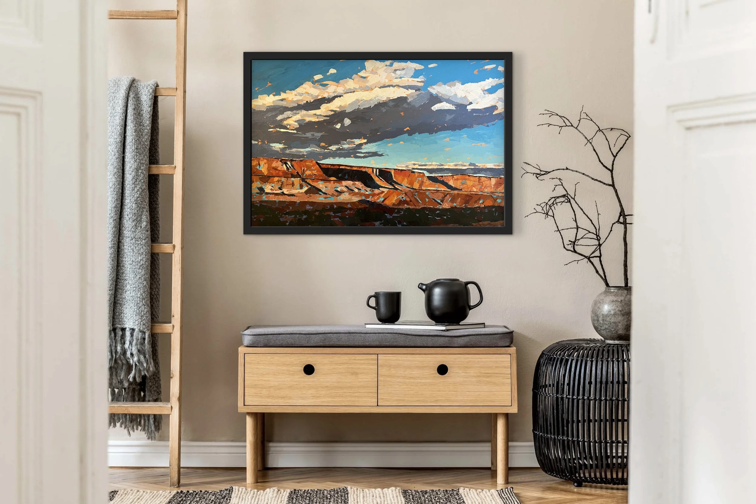 Here it is staged with an app I use. (My house isn’t this cool.) Can you see some of those background colors? Up to now, my largest painting was 20x20 inches, and this one is 24x36 inches. These bigger canvases and frames take up space, and I’m starting to dream about a bigger painting studio!