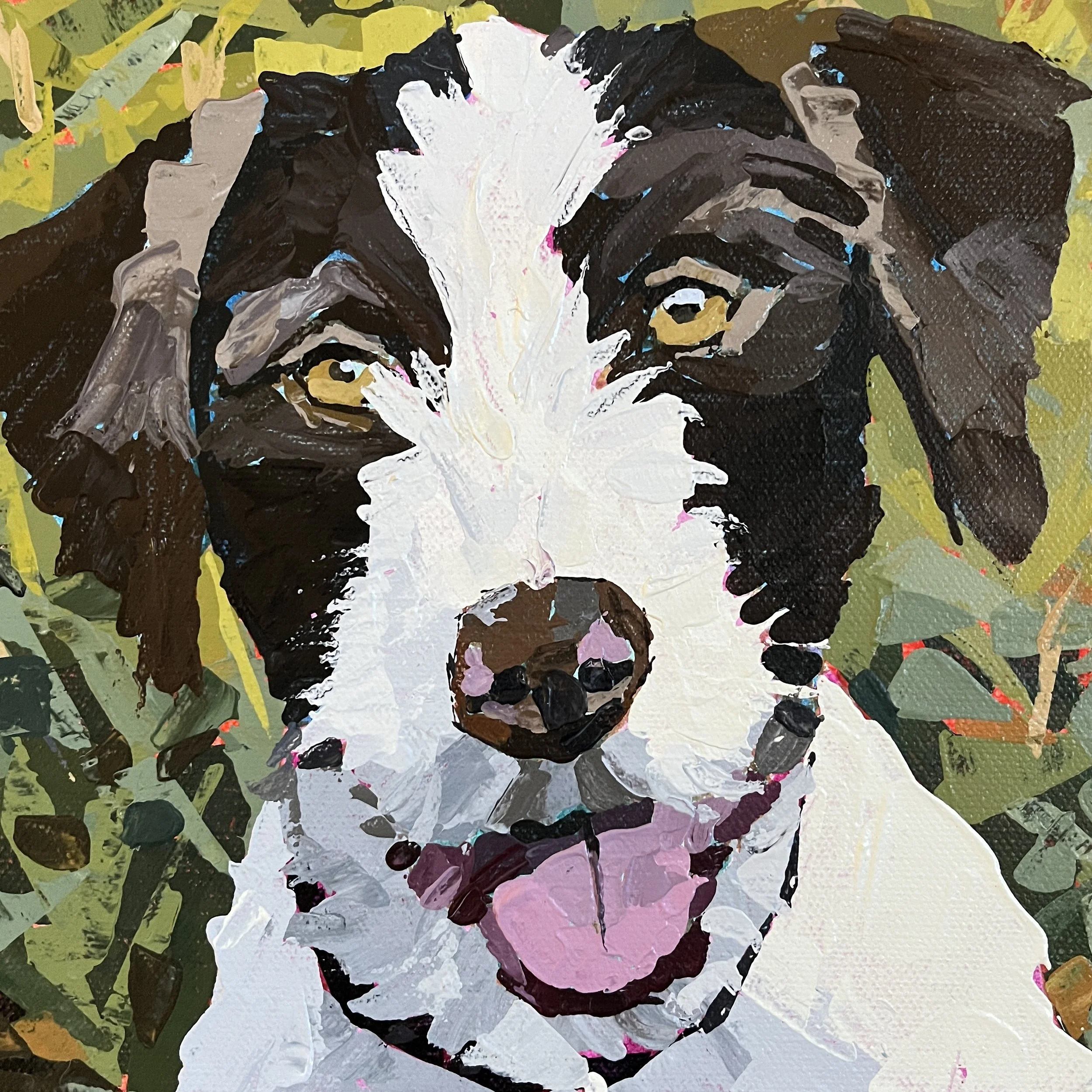 I loved painting this sweet dog. I got a kick out of a comment from the collector. They asked me to, “Make him look like the dum dum he is.” Awww, a sweet dum dum.